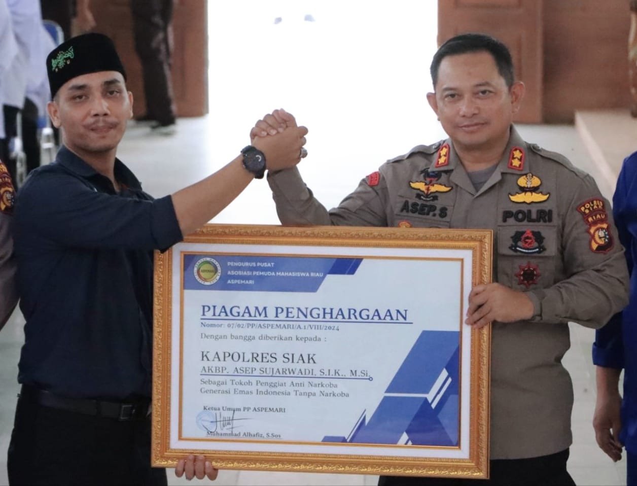 SIAK , ( jejakberitanews ) –Kapolres Siak AKBP Asep Sujarwadi SIK MSi mendapatkan apresiasi berupa penghargaan dari Asosiasi Pemuda Mahasiswa Riau (Aspemari) sebagai Tokoh Penggiat anti narkoba, dalam Seminar edukasi bahaya dan dampak negatif narkoba di Aula Putri Kacamayang, Kantor Camat Koto Gasib, Jumat (10/8) sore.