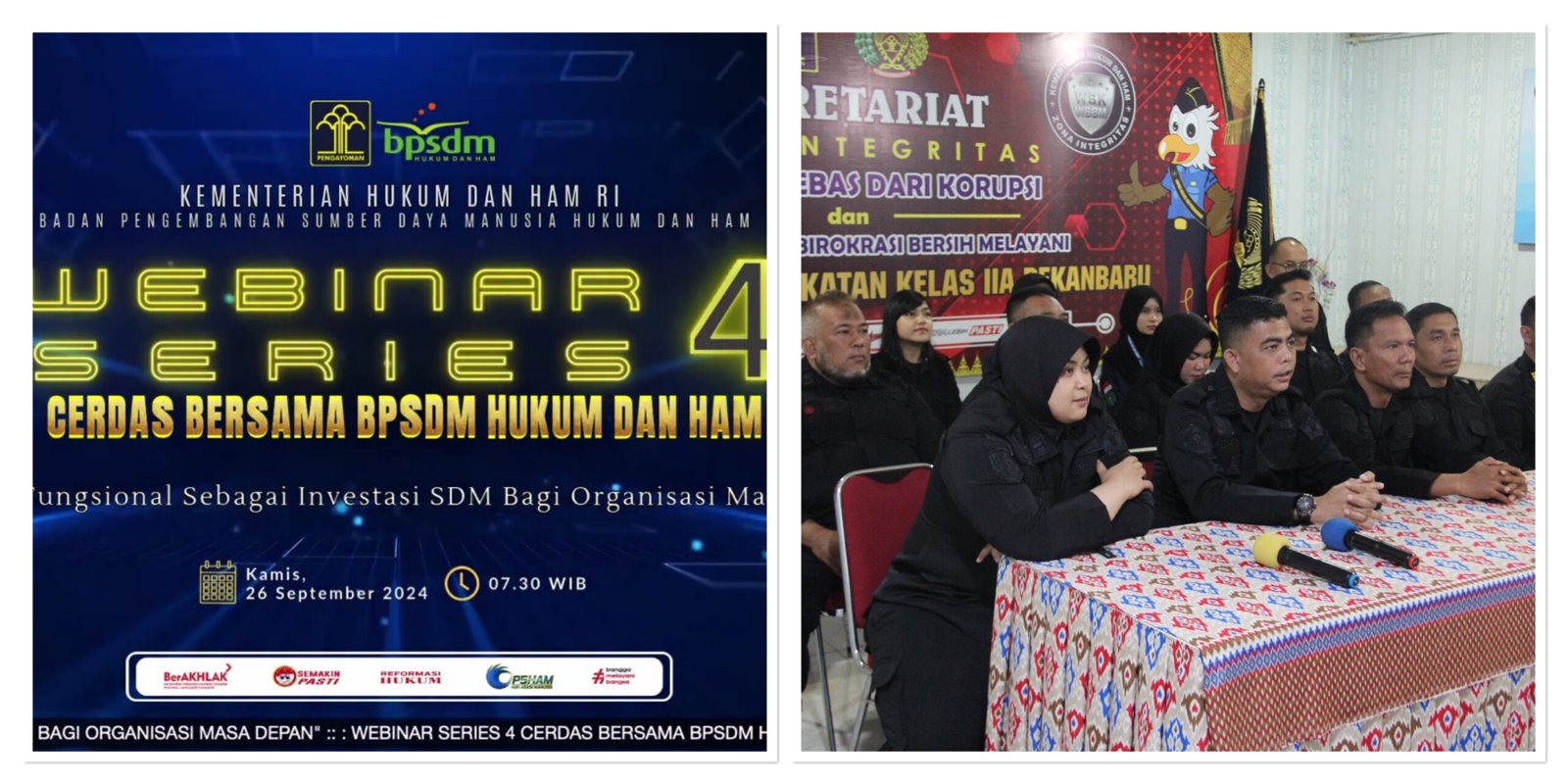 *INFO_PAS|PEKANBARU|* Sehubungan dengan Surat Kepala Badan Pengembangan Sumber Daya Manusia Hukum dan Hak Asasi Manusia Nomor SDM-SM.05.01-59 Tanggal 19 September 2024,Jajaran Lapas Kelas IIA Pekanbaru mengikuti kegiatan Webinar Series ke-4 dalam rangkaian Webinar Series (8 seri) Cerdas Bersama BPSDM Hukum dan HAM dengan materi “Jabatan Fungsional sebagai Investasi SDM bagi Organisasi Masa Depan” secara daring. Kamis (26/09/24).