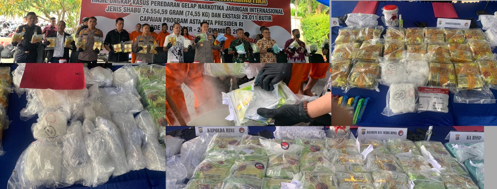 Dalam Wujudkan Asta Cita Presiden Ri, Kapolda Riau Dan Jajaran Memusnahkan 74.554,59 Gram Sabu Dan Ekstasi 29.011 Butir Dalam Peredaran Gelap Narkotika Jaringan Internasional