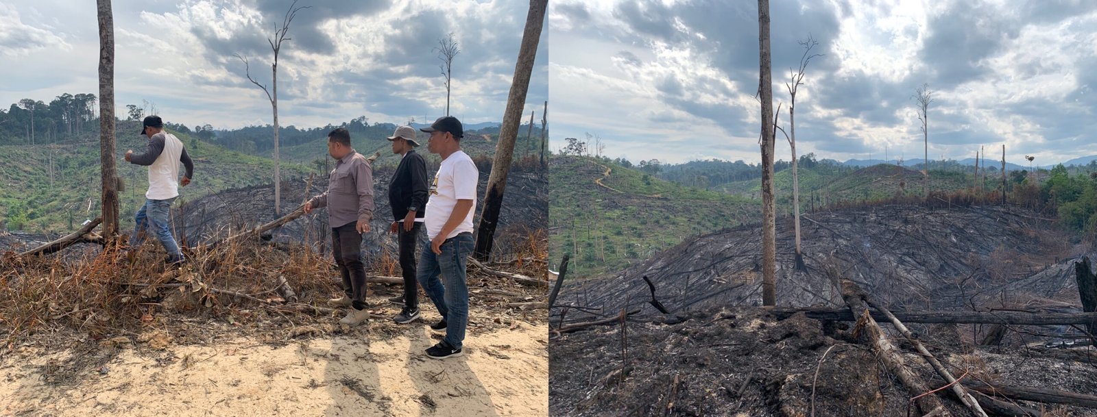 Dari hasil penelusuran dan pengecekan ke lokasi oleh tim media, di dapati sebagian besar dari lahan Hutan Desa Pemandang terbakar atau dibakar oleh oknum yang tidak bertanggung jawab, terpantau di lapangan lahan yang sudah di pasangi tapal batas dan yang sudah reboisasi juga habis dimakan api. (Tim Media Investigasi)