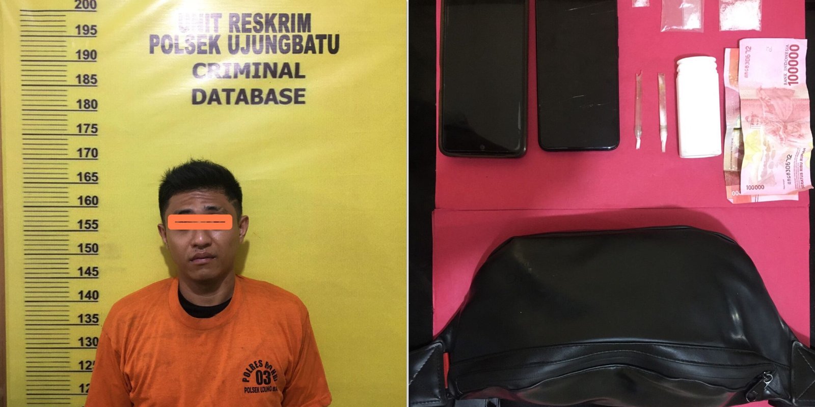 Setelah dilakukan penangkapan ditemukan dari Tersangka berupa Barang Bukti Tiga Paket Narkotika jenis Sabu 3,03 Gram, dan Tiga Paket Narkotika jenis Sabu tersebut, dibungkus Plastik Klip warna Putih Bening dan Satu Unit Hand Phone merk Realmi 5C warna biru langit, Satu Unit Hand Phone merk Vivo 1938 warna hitam, dua buah kaca pirek, satu botol plastik warna putih, satu buah selempang warna warna putih dan uang senilai Rp. 200.000,-