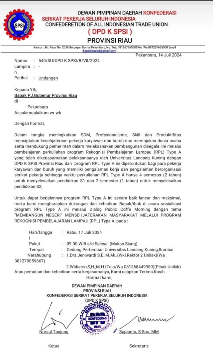 Pekanbaru, RIAU, — Dialog Publik Coffe Morning yang diadakan oleh Serikat Pekerja Seluruh Indonesia (SPSI) Provinsi Riau dan Universitas Lancang Kuning (Unilak) Pekanbaru dengan Tema, “Membangun Negeri Mensejahterakan Masyarakat Melalui Program RPL Type A, Kerjasama Universitas Lancang dengan SPSI Riau” yang akan diadakan di Gedung Perpustakaan Unilak, Rumbai, Kota Pekanbaru, Riau pada hari Rabu, (17/07/2024).