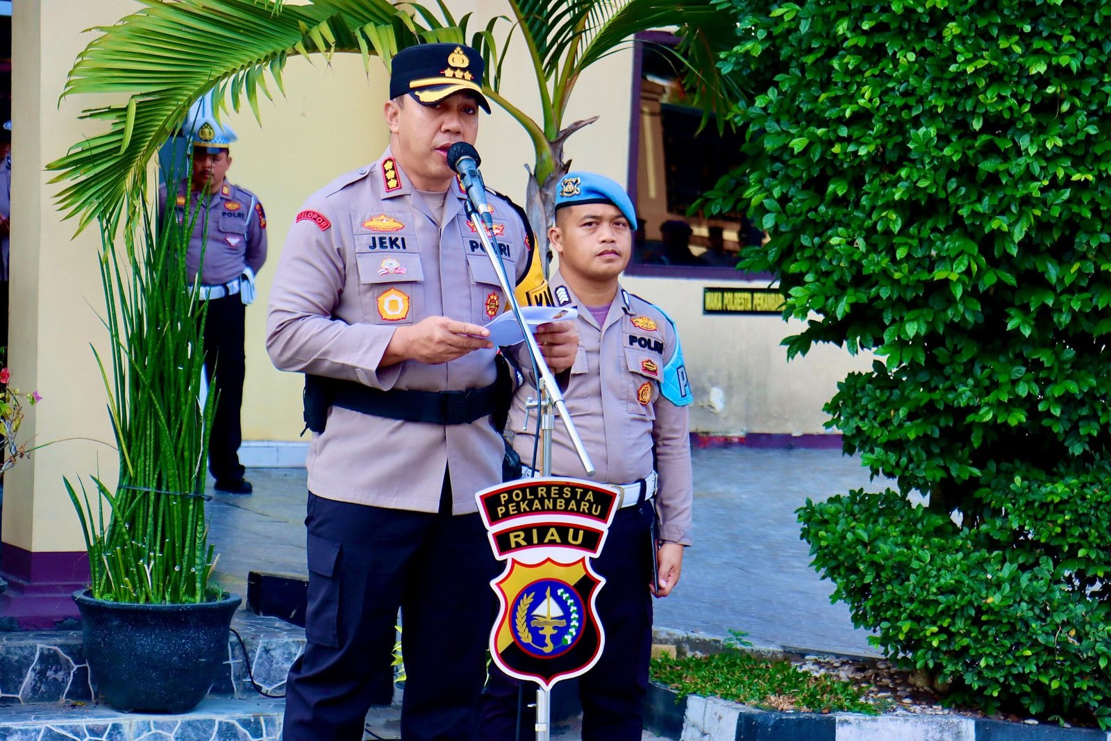 Pekanbaru, – Kapolresta Pekanbaru, Kombes Pol Jeki Rahmat Mustika, S.I.K., memimpin Apel Gelar Pasukan Operasi Patuh Lancang Kuning 2024 yang berlangsung pada pukul 08.00 WIB di Halaman Apel Mapolresta Pekanbaru pada Senin, 15 Juli 2024.