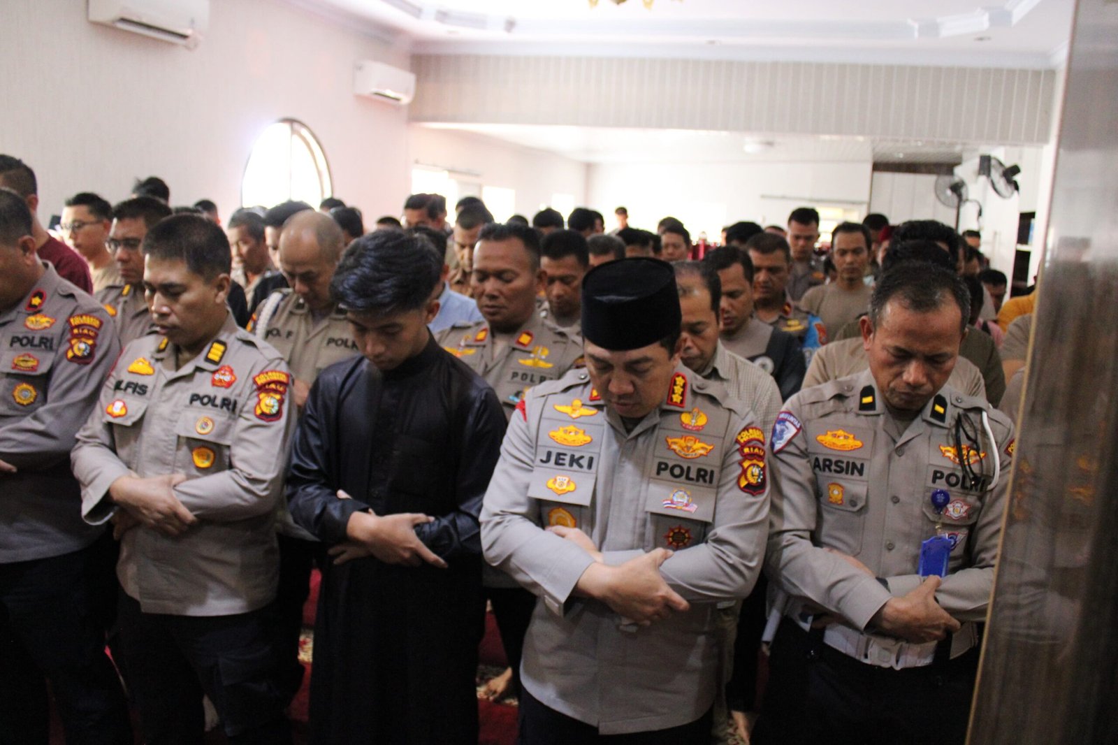 Sholat Jenazah Ghaib diikuti oleh jajaran Polresta Pekanbaru, termasuk Wakapolresta Pekanbaru, AKBP Henky Poerwanto, S.I.K., M.M., serta para Pejabat Utama (PJU) Polresta Pekanbaru.