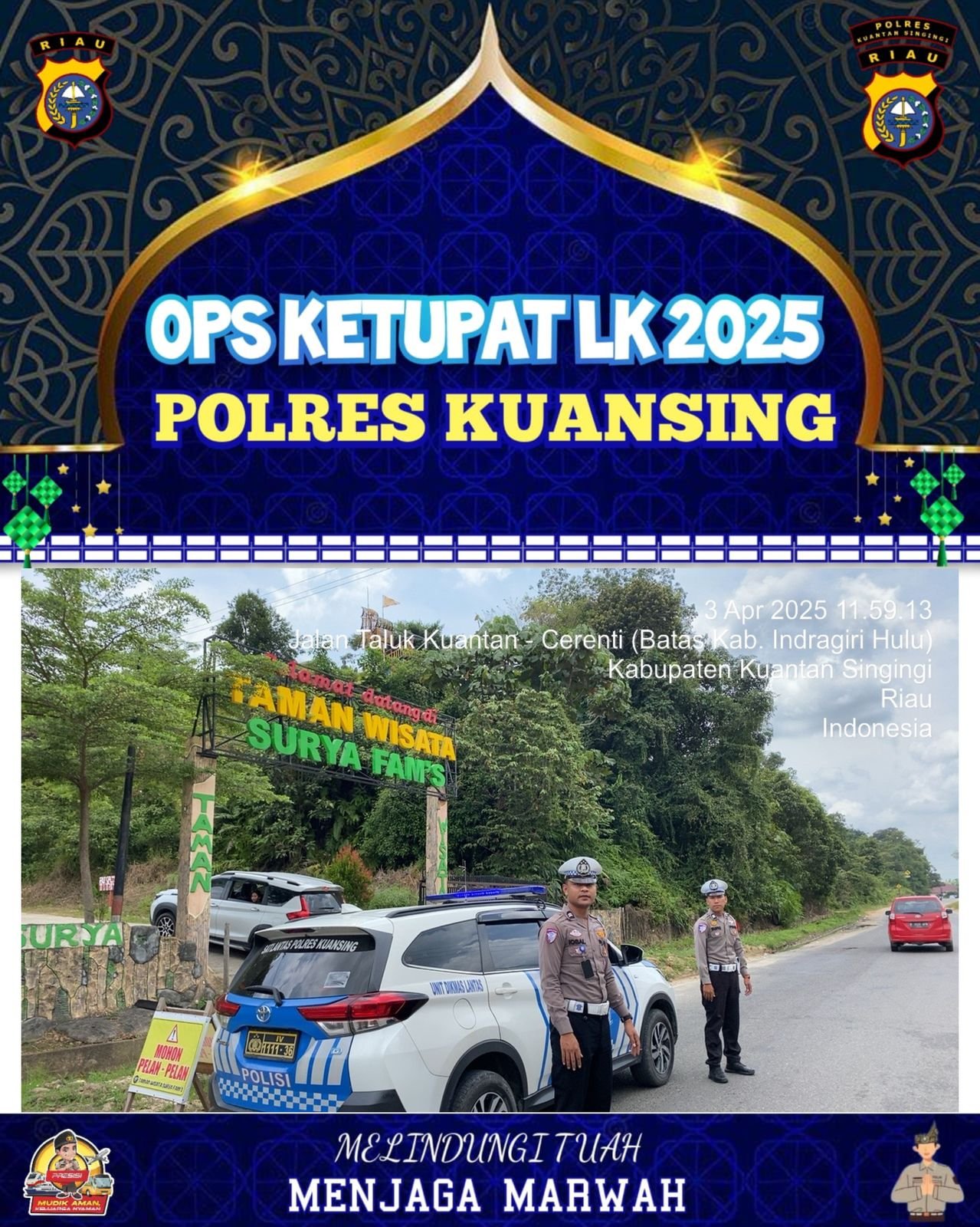 KUANTANSINGINGI,– JejakBeritaNews.com Satuan Lalu Lintas (Sat Lantas) Polres Kuantan Singingi (Kuansing) melaksanakan patroli siang di berbagai objek wisata dan titik keramaian dalam rangka Operasi Ketupat Lancang Kuning 2025 pada Kamis, 3 April 2025. Kegiatan ini dimulai pukul 13.00 WIB dan berlangsung hingga selesai, dengan tujuan menciptakan situasi yang aman dan kondusif bagi masyarakat selama bulan Ramadan.