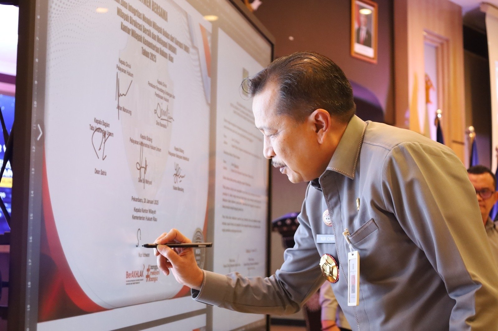 Pekanbaru –|JejakBeritaNews — Dalam rangka memperkuat tata kelola pemerintahan yang bersih dan akuntabel, Kantor Wilayah Kementerian Hukum Riau serta Kantor Wilayah Direktorat Jenderal Pemasyarakatan Riau melaksanakan penandatanganan Komitmen Bersama Pembangunan Zona Integritas serta Perjanjian Kinerja Tahun 2025. Kegiatan ini berlangsung pada Senin (20/01/2025), bertempat di Aula Ismail Saleh, Kantor Wilayah Kementerian Hukum Riau.
