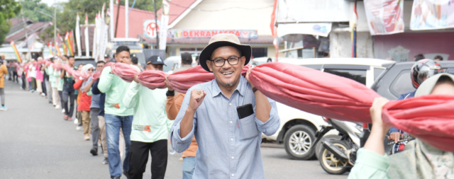 Ribuan meter kain merah putih diangkat dan ditarik bersama-sama oleh seluruh Kepala Organisasi Perangkat Daerah (OPD) dan Camat beserta staf dengan berjalan kaki mengikuti rute yang telah ditentukan.