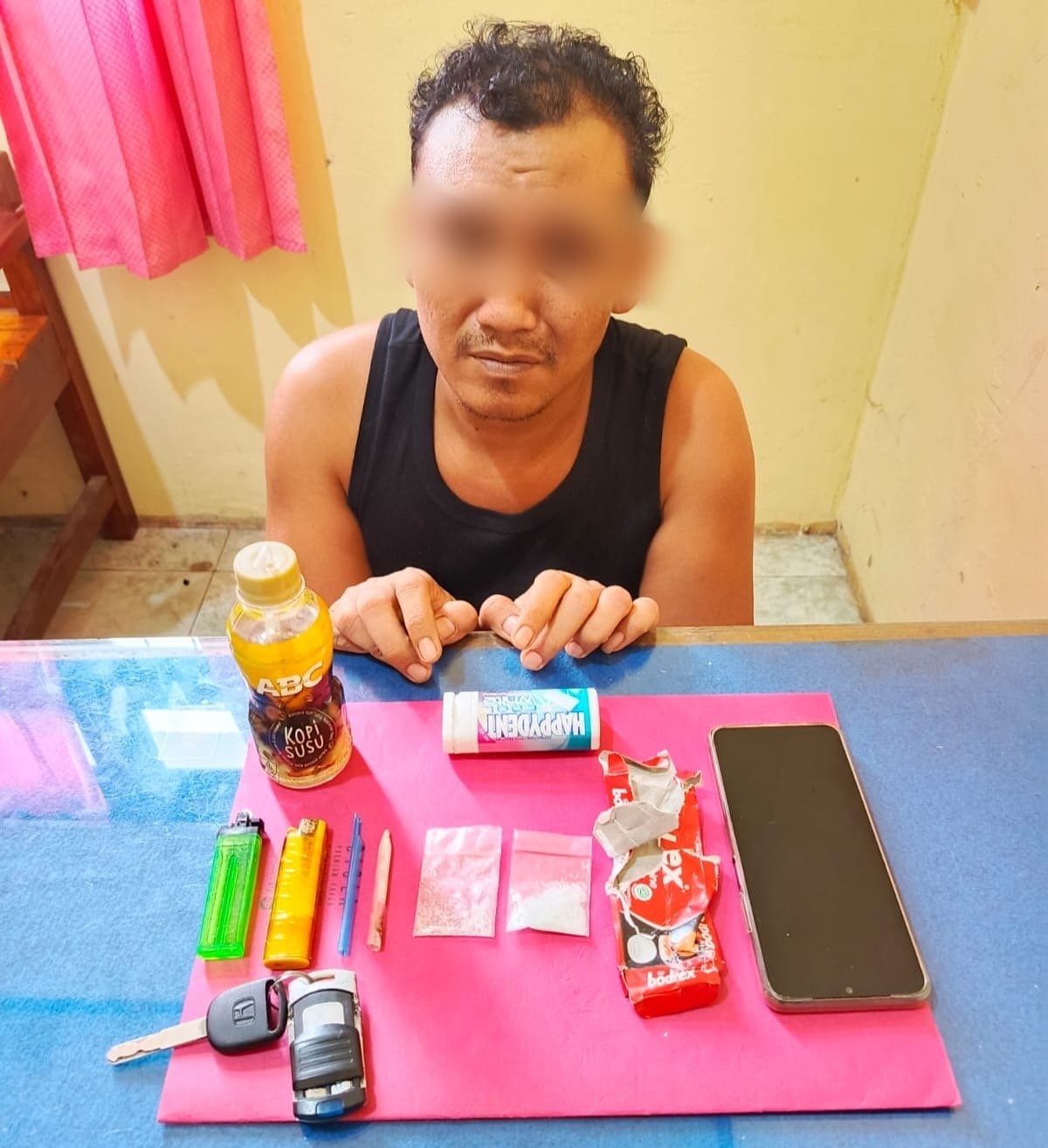 Saat dilakukan pemeriksaan, petugas menemukan benda mencurigakan berupa kotak obat bodrex yang langsung diinjak oleh pelaku untuk menghindari pemeriksaan. Setelah dibuka, ditemukan narkotika jenis sabu-sabu. Penggeledahan lebih lanjut mengungkapkan temuan narkoba lainnya yang disembunyikan dalam kotak permen Happydent.