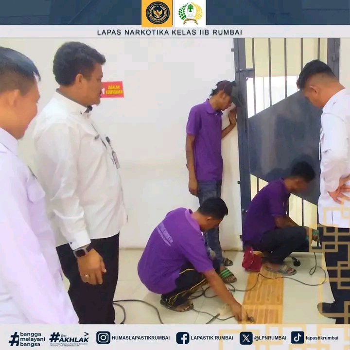 WBP Lapas Narkotika Rumbai melakukan pemasangan teralis besi pada pintu ruang besukan Lapas Narkotika Rumbai. Pemasangan teralis ini dengan metode pengelasan yang dipelajari dari pelatihan-pelatihan sebelumnya, Kamis (14/08/2025).