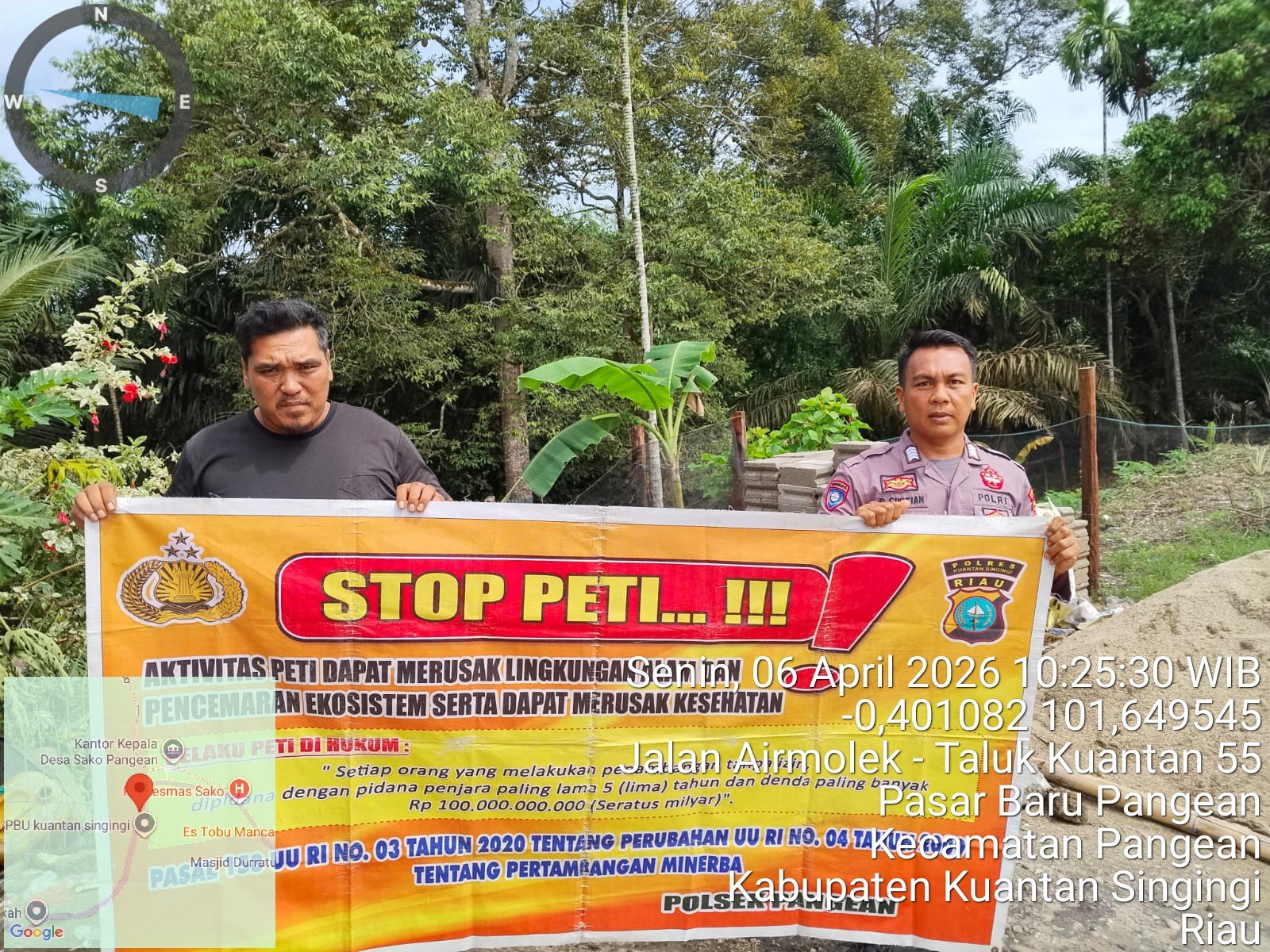 Selanjutnya, Polsek Kuantan Tengah melalui Bhabinkamtibmas juga melaksanakan sosialisasi kepada masyarakat di wilayah hukumnya. Polsek Benai turut melakukan penyebaran maklumat di Desa Tebing Tinggi guna meningkatkan kesadaran masyarakat terhadap dampak negatif PETI.