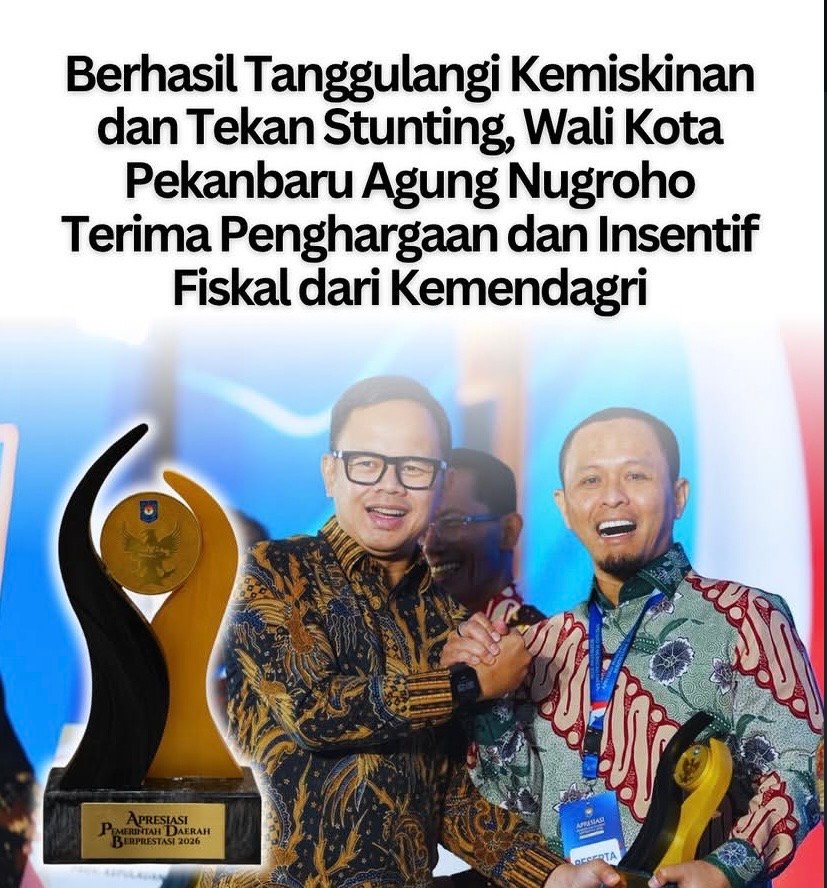Pekanbaru(jejakberitanews.com) Wali Kota Pekanbaru, Agung Nugroho, kembali menorehkan prestasi dengan menerima penghargaan dari pemerintah pusat melalui Kementerian Dalam Negeri (Kemendagri). Penghargaan ini diberikan atas keberhasilan Pemerintah Kota Pekanbaru dalam menekan angka kemiskinan serta stunting selama masa kepemimpinannya.